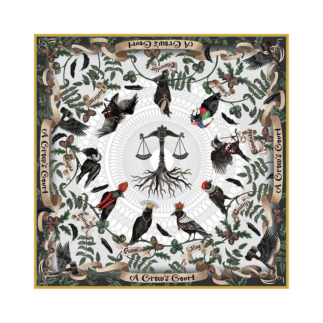 Within the artwork, nine crows encircle the scales of justice while perched on walnut and oak branches. Walnut is the most common wood used to make a judge’s gavel and sounding block, both walnut and oak symbolising wisdom and knowledge. Each crow is garbed in outfits befitting a medieval court as twisting scrolls determine their rank, with their floating black feathers synonymous with protection and clarity.