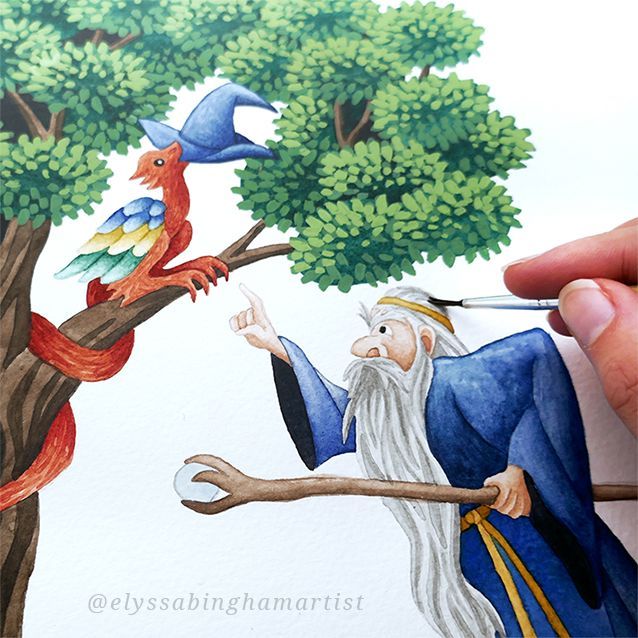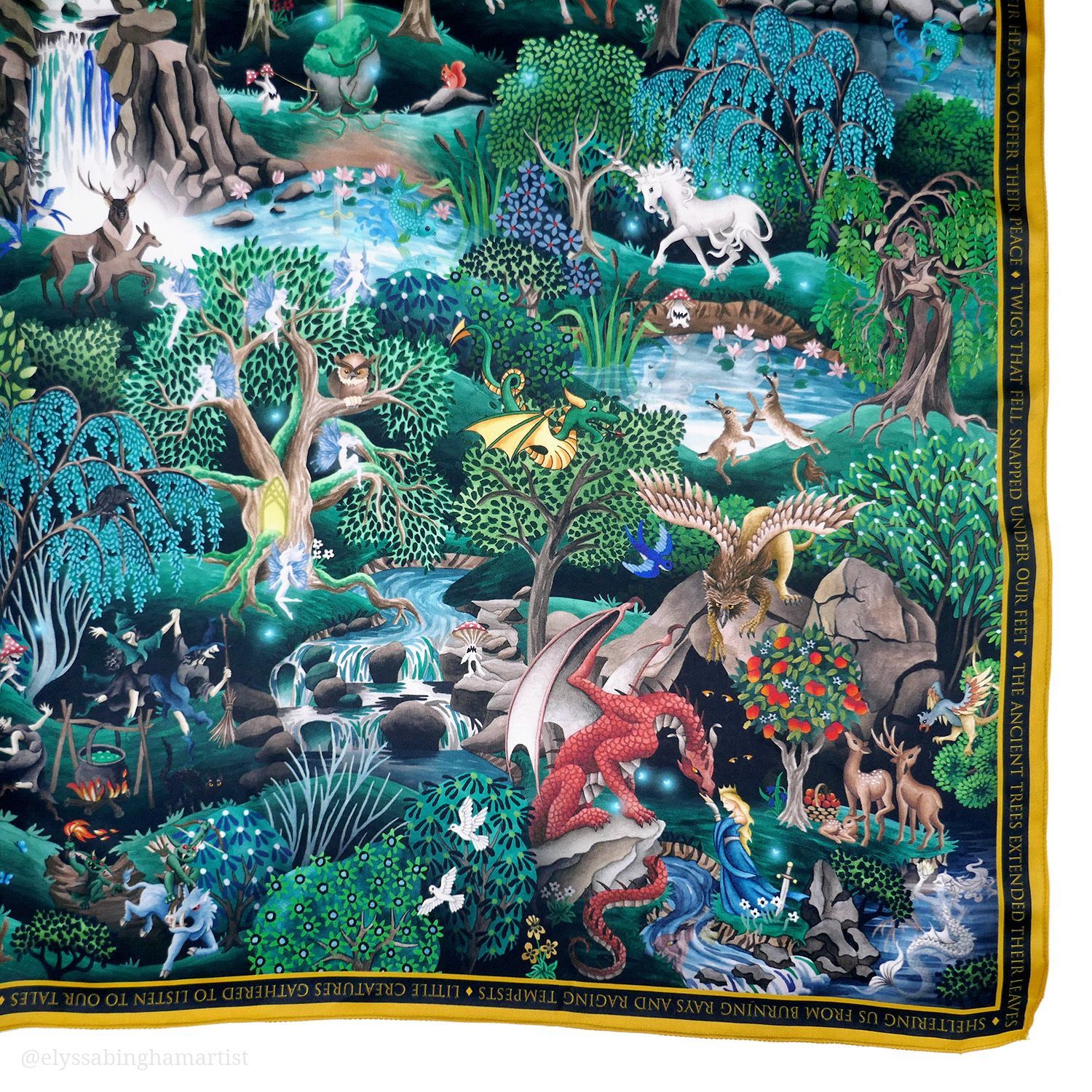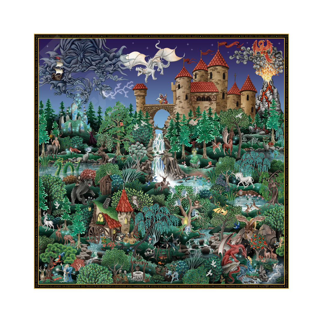All the fantastical tales of dragons, castles and mystical beasts that live in an enchanted forest are illustrated throughout the landscape of this art. Each creature is as characterful as the world they inhabit. There are goblins that steal riches and fire. Witches that dance to songs and spells. Water nymphs who entice victims to the depths of their lakes and dragons who befriend royals.