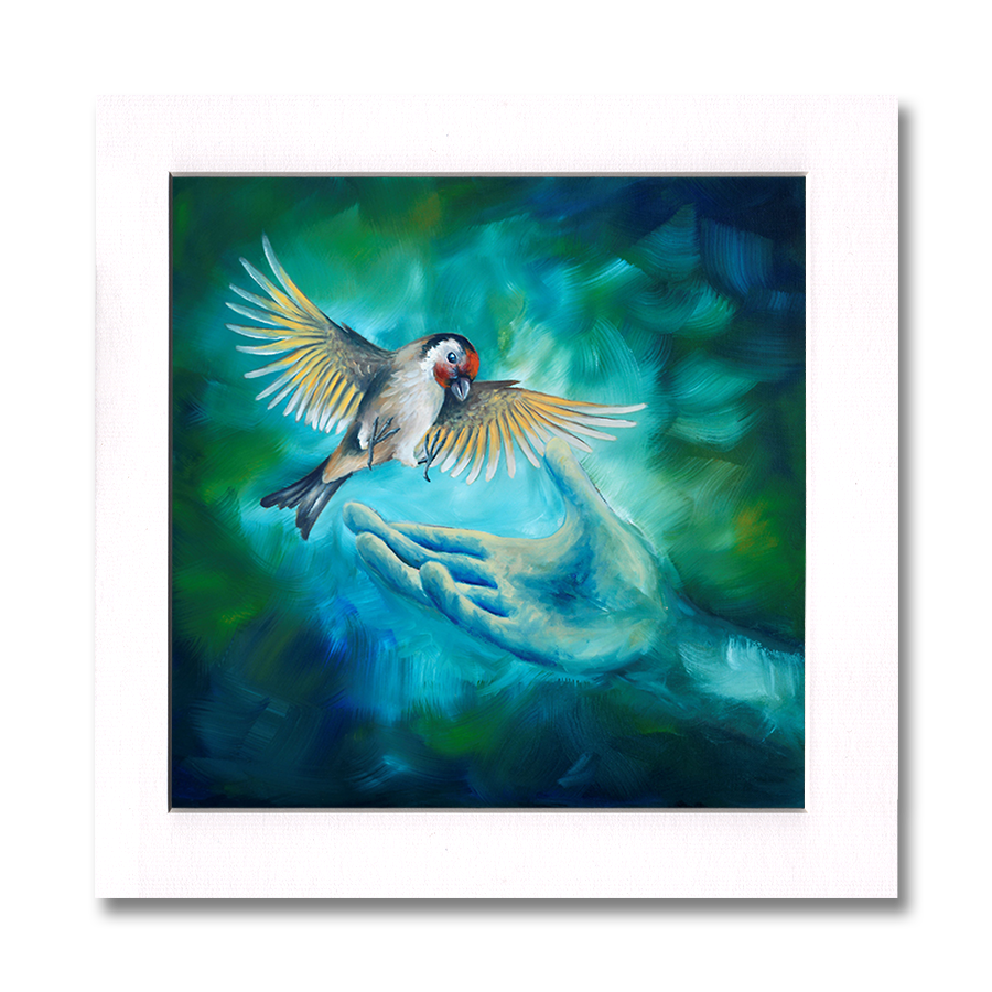 In each painting, the delicate bird appears through a storm just as love will visit us in the torment of loss and grief. Not only do birds bring us these small tokens of love but also feathers, sounds, music and smells. It is these small moments that hold our gaze and bring us clarity and peace that we are truly with our loved one, even if fleeting like a bird.