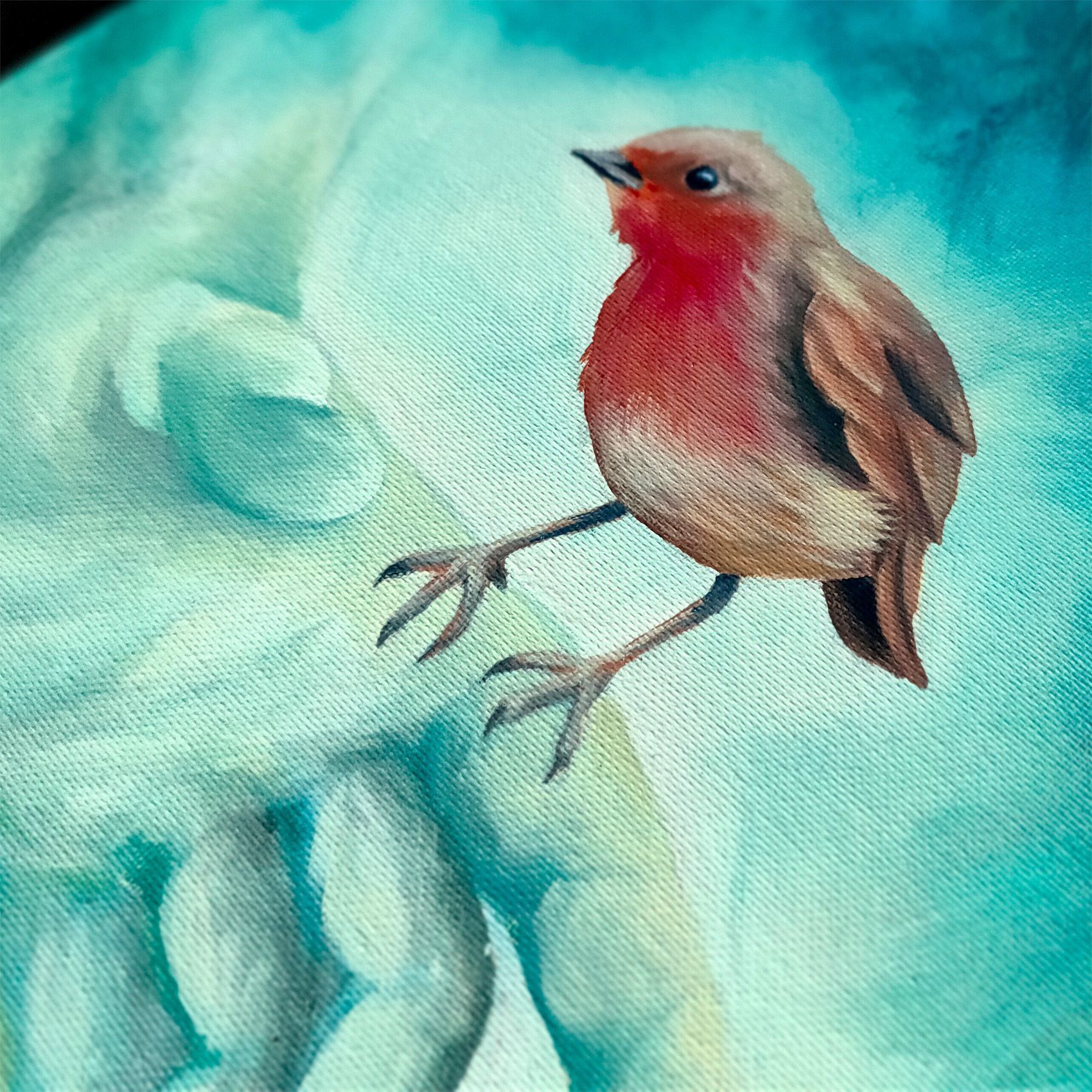 Everyday, I see the fleeting sight of a bird and seeing nature encapsulated by the freedom and innocence of a flying bird is comforting. It lifts the grieving heart which longs to fly away with the bird and reunite with their loved one. Robins and small garden birds have always held a special place in my heart but their visits are often short lived. Since my dad passed, birds continue to visit the garden in cursory greeting, sometimes singing a song or two. These moments are beautiful to see, but there have been a handful of times where one has perched a little too long and glanced at me too quietly without a song in silent greeting. These paintings capture the essence of this greeting which is bizarrely transcending, especially in moments of anguish and melancholy. Birds have often been associated as messengers from our loved ones and a sign that they are still with us in as many ways as they can express beyond death.